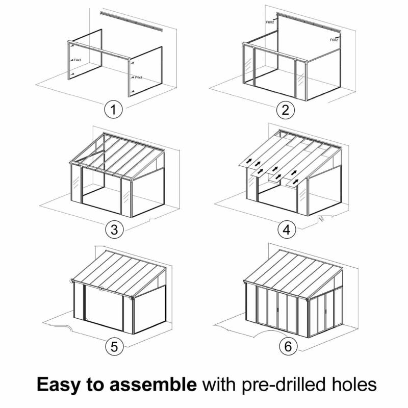 8mm twin-wall polycarbonate sheet on the roof panels and 3mm transparent acrylic wall panels and door panels offer UV blocking feature to protect your outdoor furniture from the harmful UV rays.