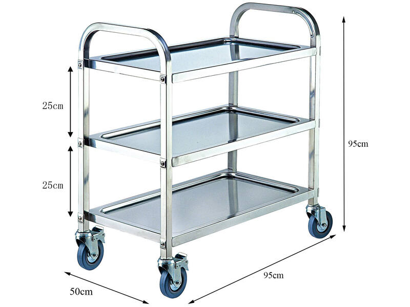 The stainless steel trolley has three sturdy trays and its solid craftsmanship makes it perfect for usage in canteens, restaurants, hotels, public facilities or at your home. You can serve food and drinks to many guests at the same time and clear used dishes and bring them to the kitchen. The trolley is made from stainless steel and is therefore especially durable and easy to clean.
